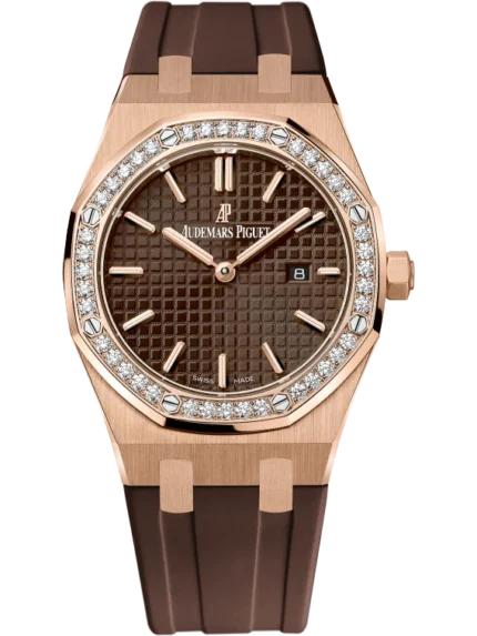 Royal Oak Quartz 33MM Brown Rubber Strap Brown Dial With Grande Tapisserie Pattern 18-Carat Pink Gold Case Diamond-Set Bezel QUARTZ Ref. 67651OR.ZZ.D080CA.01