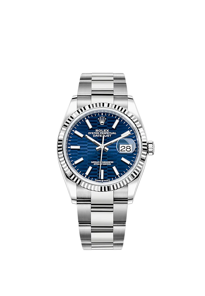 Home Rolex Datejust Stainless Datejust 36 36mm Oyster Braclete Oystersteel And White Gold With Bright Blue Fluted Motif Fluted Bezel Reference 126234