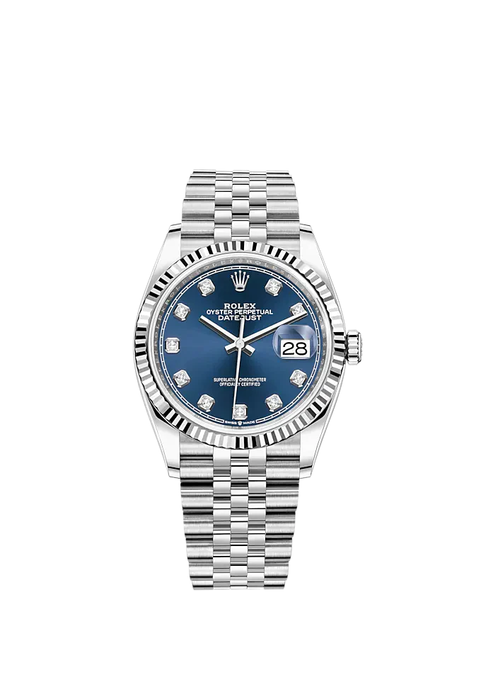 Datejust 36 36mm Oystersteel Jubilee Bracelet And White Gold With Bright Blue Dial Fluted Bezel With Diamond Marker Reference 126234