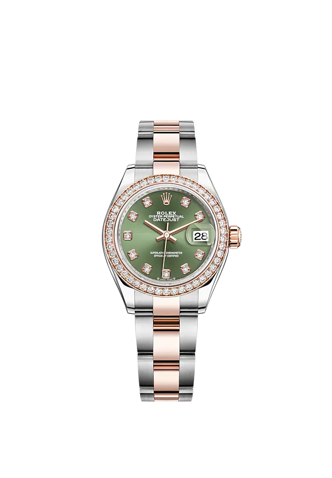 Lady-DateJust 28mm Oyster Oystersteel Bracelet And Everose Gold With Olive-Green Dial Diamond-Set Dial And Diamond-Set Bezel Reference 279381RBR