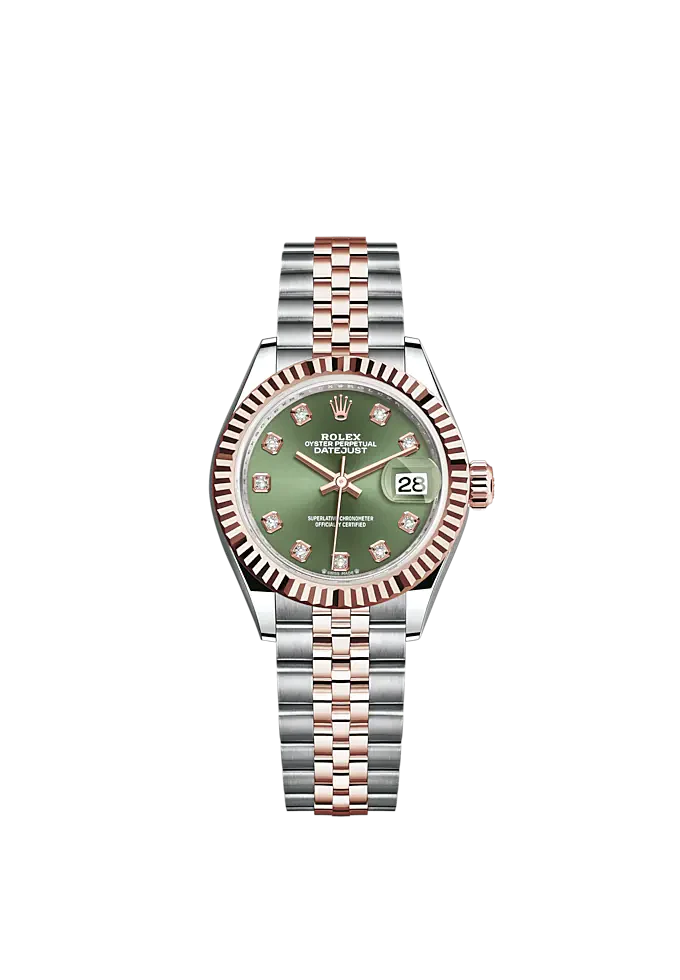 Lady-DateJust 28mm Oystersteel Jubilee Bracelet And Everose Gold With Olive-Green Dial Diamond-Set Dial Fluted Bezel Reference 279171