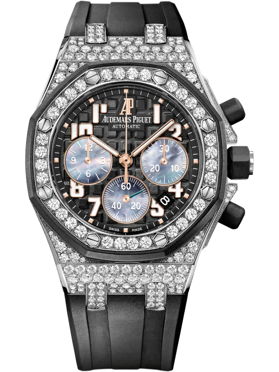 Royal Oak Offshore Ladycat Chronograph 37MM Black Rubber Strap Black Dial With Méga Tapisserie Patterns 18-Carat White Gold Case Diamond-Set Bezel LADYCAT CHRONOGRAPH Ref. 26212CK.ZZ.D002CA.01